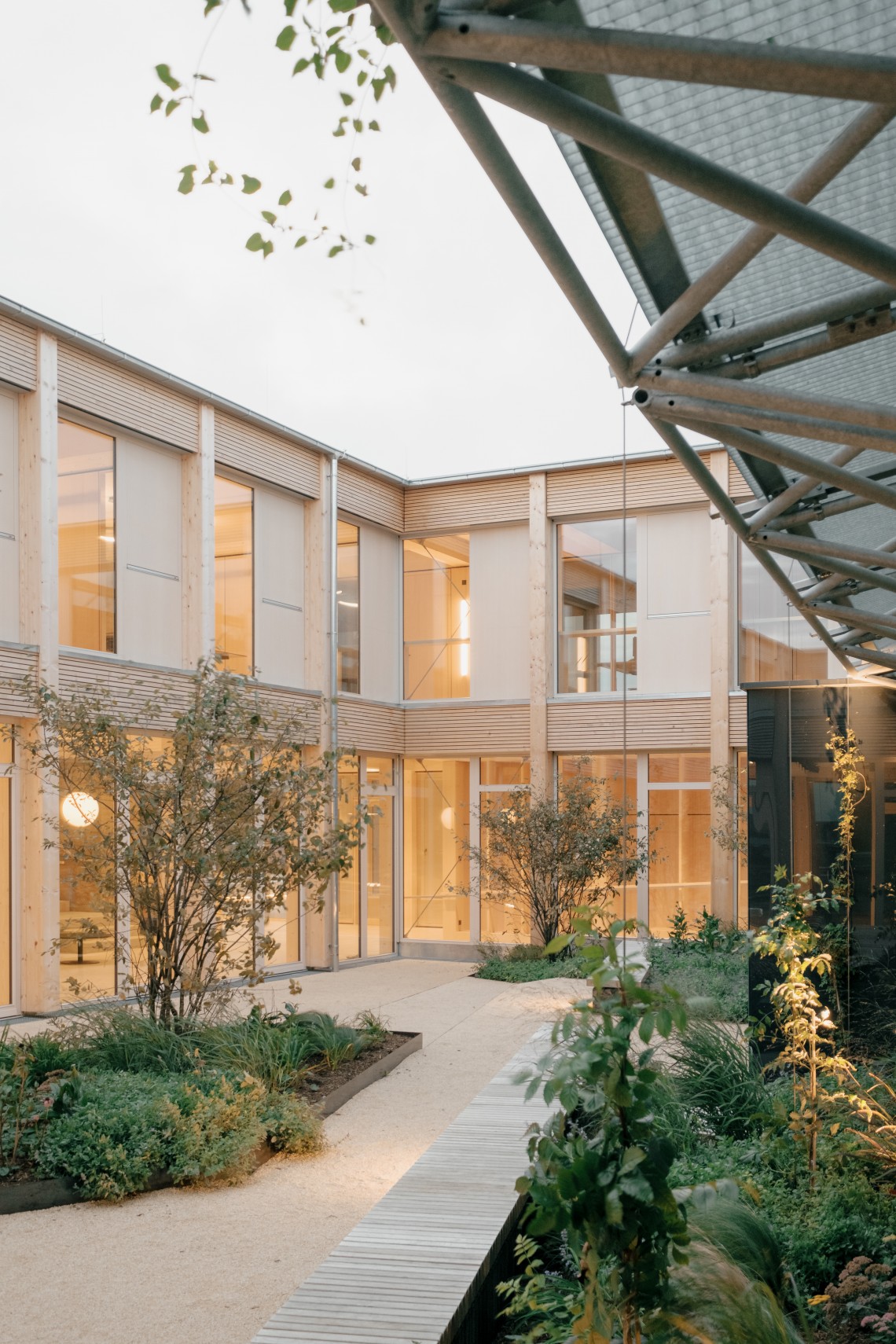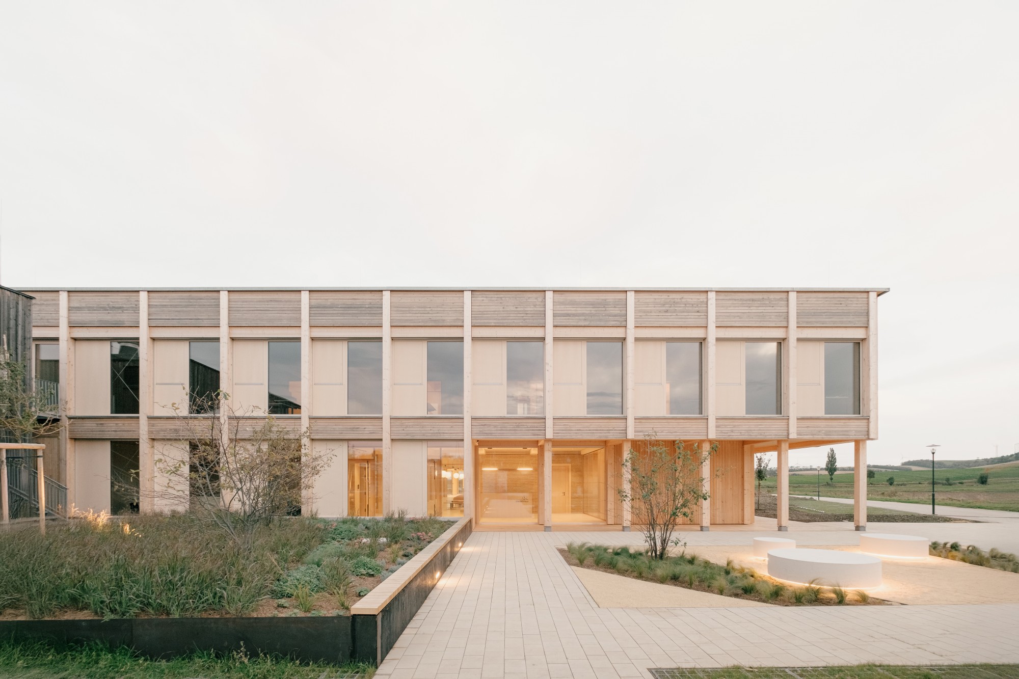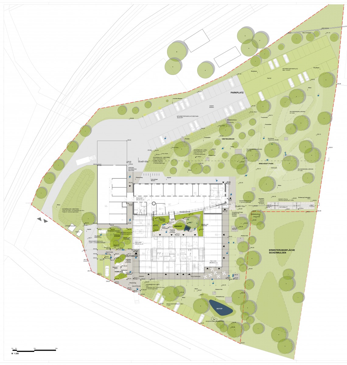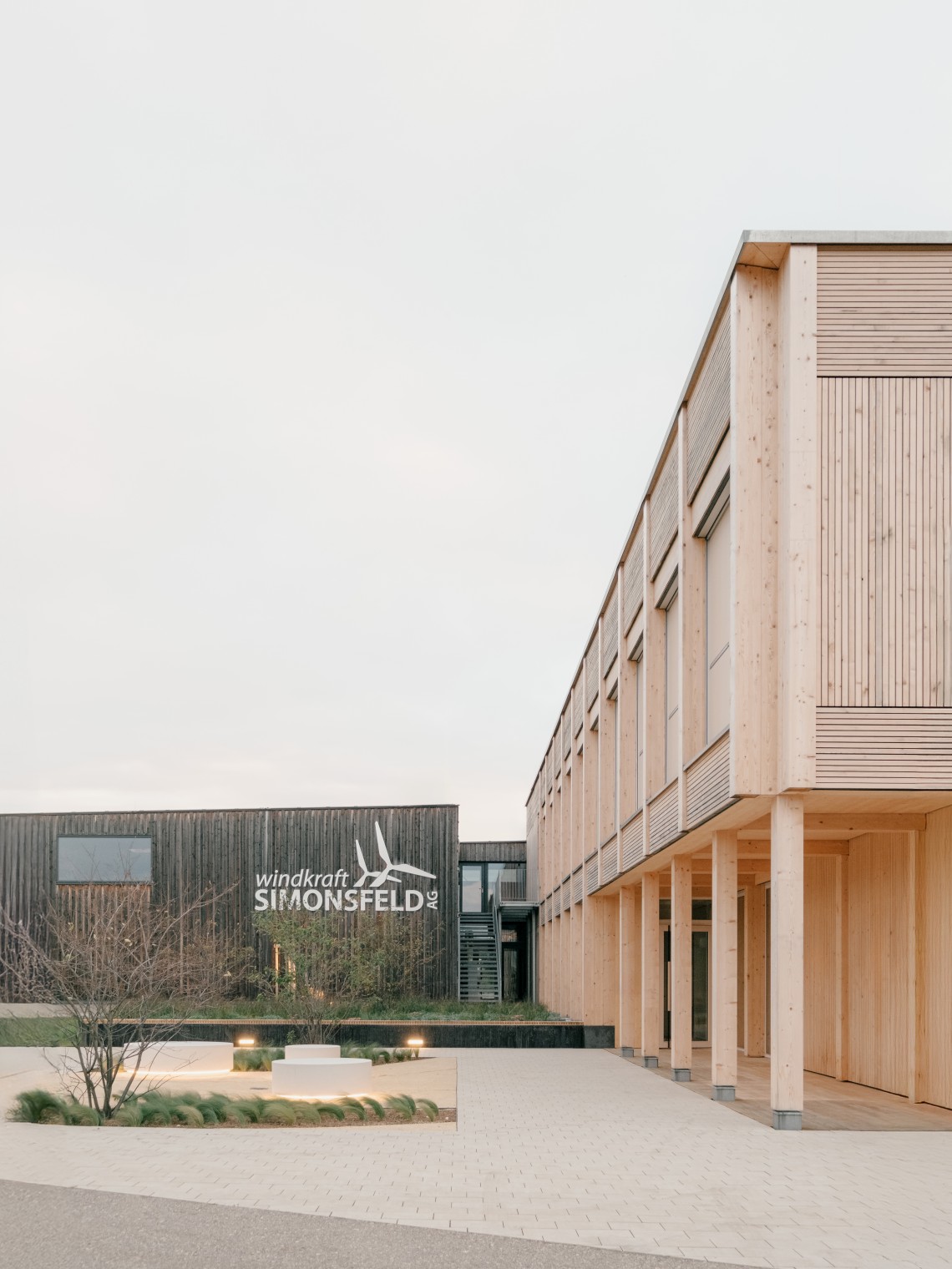 Ausgangspunkt für den Entwurf der neuen Firmenzentrale der Windkraft Simonsfeld AG war neben dem Architekturkonzept von Juri Troy architects, der landschaftliche Kontext und die dynamische Formensprache der Windräder. Flächen und Konturen spiegeln diese Dynamik in der Gestaltung des Vorplatzes und des Innenhofes wider. Die das Gebäude umspülende Landschaft wiederum ist sehr naturnah und ökologisch gestaltet, wird topographisch sowie mittels unterschiedlicher Vegetationstypen gegliedert. Hügel, Mulden, Wiesen- und Rasenflächen schaffen unterschiedliche räumliche Situation und dienen als Ökologieflächen für Flora und Fauna. Der Sickerteich im Vorfeld der Zentrale reinigt das Regenwasser der Dachflächen und führt dieses einer kontrollierten Versickerung bei. Das große Holzdeck am Gebäude wird in den Garten erweitert und verschneidet so die Architektur mit dem umgebenden Garten und der Landschaft. Am Gelände wurden vielseitige Aufenthaltsflächen für Mitarbeiter und Besucher geschaffen. Neben Hängematten, Sitz- und Liegedecks gibt es mit Robinienhölzern gestaltete Calisthenics Geräte zum kurzen energetisieren oder aushängen zwischendurch.