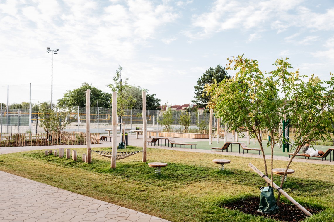 Der zentrale Bereich ist vor allem dem Sport gewidmet. Neben Fitnessstationen für unterschiedliche Muskelgruppen gibt es eine Calisthenics-Anlage und Tischtennistische. Beim mittleren Eingang zum Freiraum entsteht eine Pergola mit Trinkbrunnen, welche zum Verweilen oder kurzen verschnaufen während dem Training einlädt.