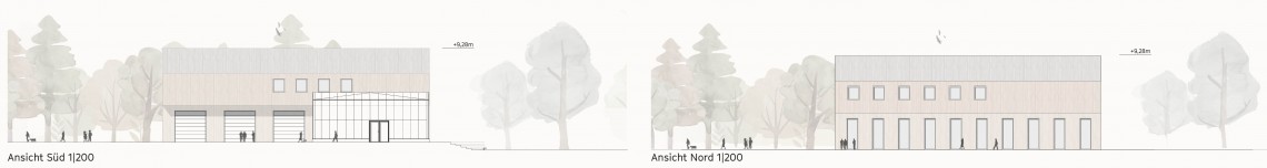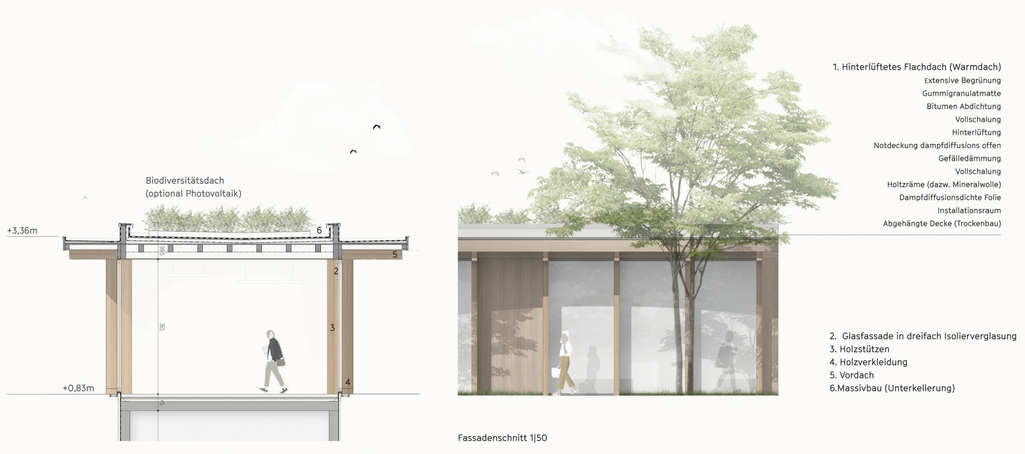 Die städtebauliche Setzung optimiert den Nutzungsbereich zwischen Besuchern und Mitarbeitern/Gärtnern und respektiert die historische Struktur des Formalgartens. Die zentrale Freitreppe wird in ihrer historischen Lage und Symmetrie wiederhergestellt; die barrierefreie Erschließung erfolgt über neue seitliche Rampen entlang des Formalgartens. Im Ideenteil entsteht ein neu organisierter Wirtschaftshof: Werkstätten, Lager und Garagen im Erdgeschoss sowie ein heller, nutzungsflexibler Sozialtrakt mit Aufenthaltsbereichen und Terrassen im Obergeschoss. Teile des bestehenden Sozialtrakts werden zu einem lichtdurchfluteten Veranstaltungssaal umgebaut. Ein verglaster Korridor bzw. Wintergarten bildet eine verbindende Spange und schafft die barrierefreie Anbindung zur naturkundlichen Station. Das Cabrio-Glashaus dient dabei als saisonal flexibel nutzbares Bindeglied.