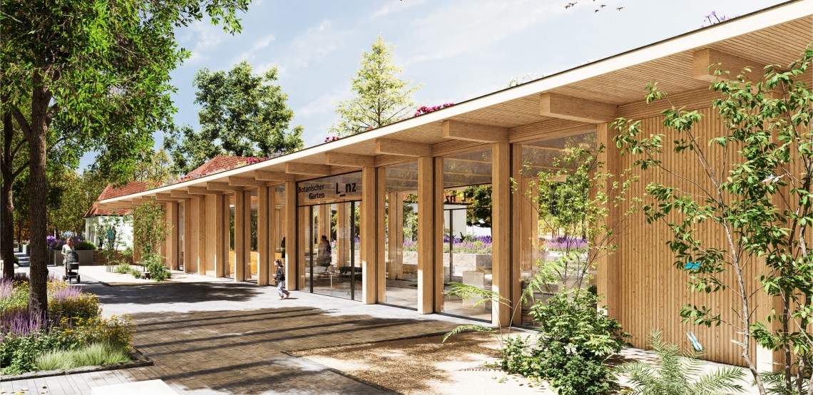 Das neue Eingangsgebäude bildet den zentralen Dreh- und Angelpunkt des Botanischen Gartens und verbindet das Glashaus mit dem Bestandsgebäude. Die klare Bogenform nimmt die Symmetrie der Gartenanlage auf und öffnet ein weites Panorama in die Freianlagen. Durch die transparente Architektur mit Holz, Glas und feinen Lamellen entstehen helle Innenräume, die fließend mit dem Außenraum verbunden sind. Der Vorplatz wird durch ein auskragendes, elegant geschwungenes Vordach definiert, das Besucher willkommen heißt und eine einladende Geste zum Botanischen Garten schafft.