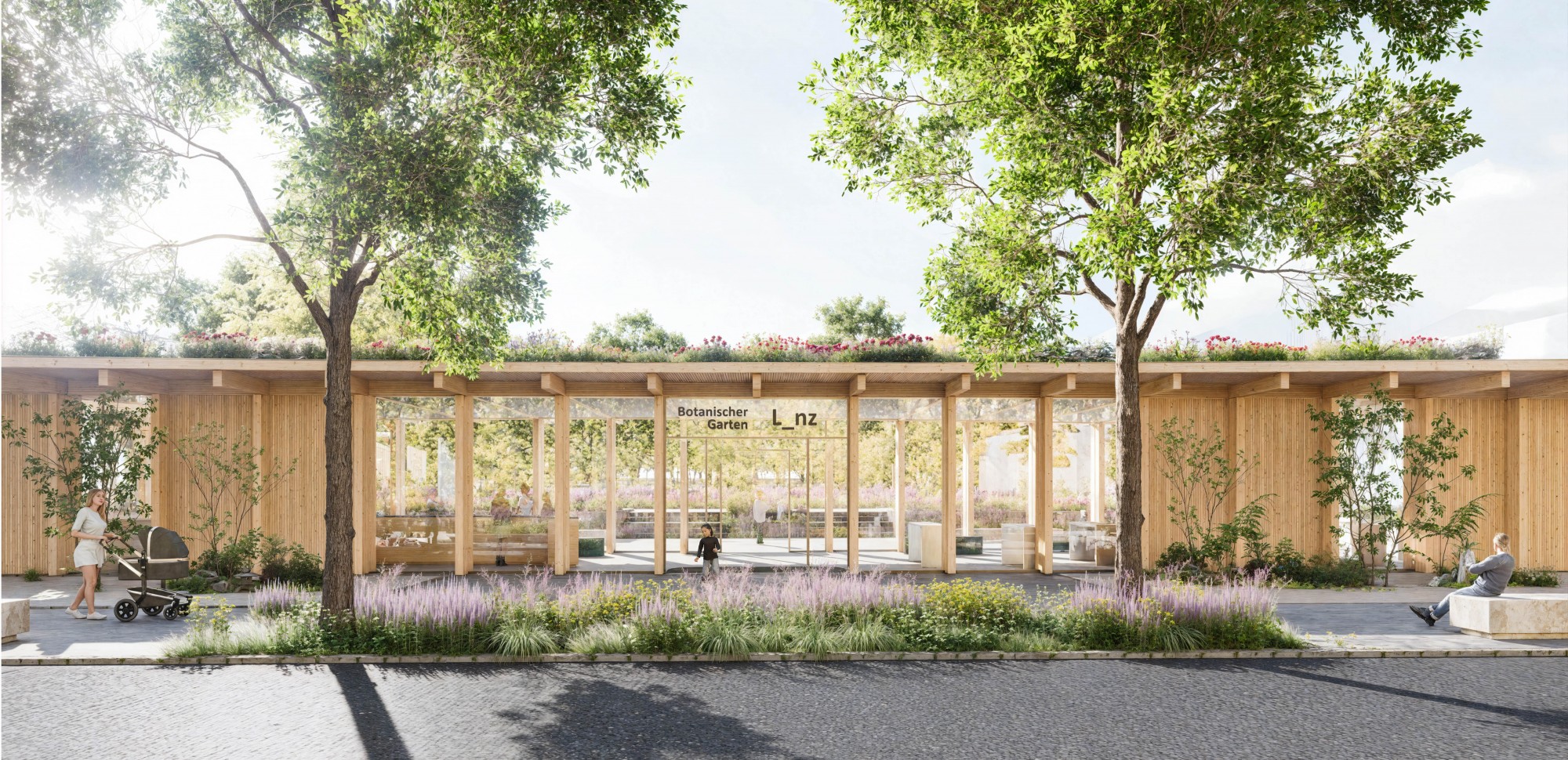 Auf dem Dach entsteht ein extensives Biodiversitäts-Gründach mit Retentionselementen, variierenden Substrathöhen, Grobkiesbereichen und Insektenhabitaten, dass die ökologische Qualität des Gebäudes steigert. Die Regenwassersysteme von Bestand und Neubau werden gekoppelt; überschüssiges Regenwasser wird in einer zentralen Zisterne gesammelt und zur Bewässerung der Gartenflächen genutzt. Das Gesamtkonzept schafft damit eine nachhaltige, funktionale und atmosphärisch starke Ergänzung zum Botanischen Garten Linz.
